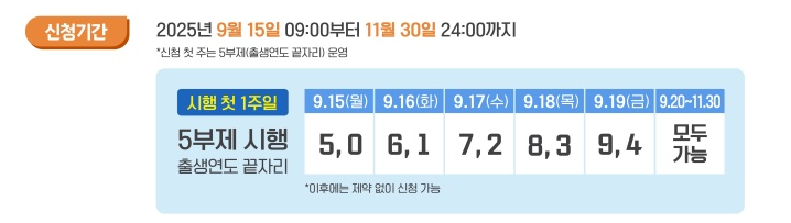 구분 내용 신청 기간 2025년 9월 15일 09:00 ~ 11월 30일 24:00 대상 2024년 카드 사용 실적 있는 만 19세 이상 내·외국인 신청 제한 첫 주(9.15~9.19) 출생연도 끝자리 5부제 → 이후 자유 신청 신청 방법 상생페이백.kr 접속 → 본인 인증 → 신청 (약 2일 내 결과 안내) 오프라인 지원 전통시장 상인회, 소상공인지원센터, 지방중기청, 국민·우리·농협 영업점
