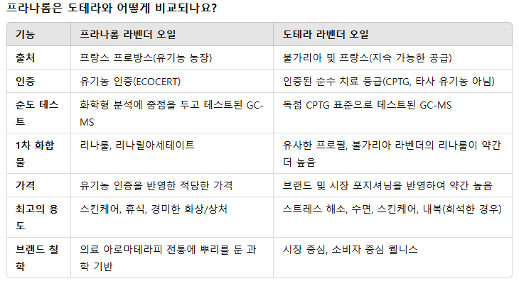 프라나롬의 라벤더는 프랑스 기원을 반영하는 깊은 꽃 향과 함께 더욱 허브 향이 납니다. 이에 비해 도테라의 불가리아 라벤더는 때로는 더 달콤하고 부드러운 향 프로필을 가질 수 있으며 일부 사용자는 개인 향수나 디퓨징을 선호할 수도 있습니다.