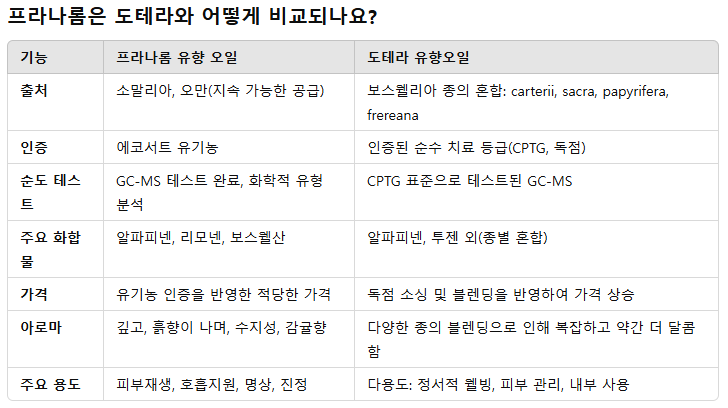 프라나롬과 도테라 유향 오일의 주요 차이점